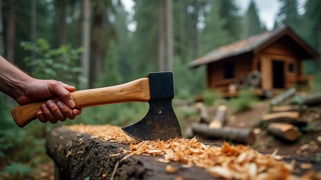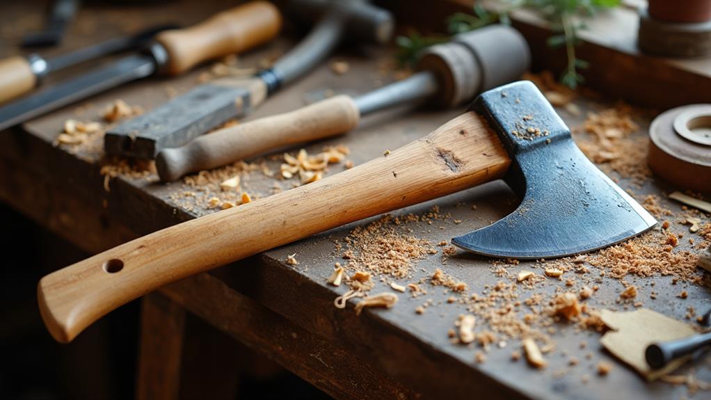 Final touches are crucial to confirm your modified axe performs at its best. After securely attaching the handle, focus on refining the axe edge. Use a whetstone or file, maintaining a consistent angle of 25-30 degrees. This angle ensures the cutting edge is both sharp and durable, making it efficient for tough, off-grid tasks.