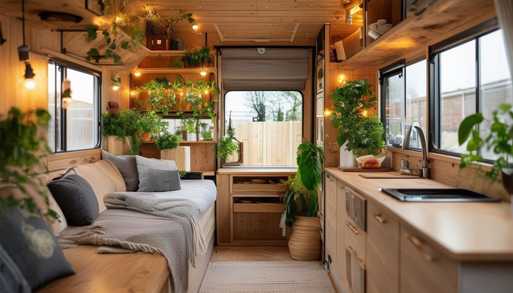 Seagrass baskets and jute rugs can provide stylish storage solutions while maintaining a natural aesthetic. These materials are biodegradable and sustainable, making them a perfect fit for an eco-conscious tiny home. By focusing on these eco-friendly home accents, you'll create a living space that's not only stylish but also kind to the environment. Remember, every small substitution adds up, turning your tiny home into a sanctuary of sustainability and style.